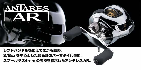 現在のベイトリールにおいて最も使用頻度の高い3/8ozクラスのルアーのキャスタビリティーと扱いやすさを焦点にして、その究極を目指すことから設計が進められた、アンタレスとは異なる性格を持ったアンタレスAR。レギュラーのアンタレスがスプールに37mmの大口径を選択したのに対し、ARは径34mm・幅22mmを選択。その上でSVSユニットからスプールの肉厚のバランスに至るまでを計算し、3/8ozへの追従性のために徹底した軽量化を図りました。結果、従来のブレーキブロックでは過剰ブレーキとなり、さらに軽いブレーキブロックの設定を必要とするほど敏感な、ユニット重量12gのGフリースプールUが誕生。ラインキャパシティは14lb.100mで、「AR」すなわちオールラウンドとして国内のみならず海外においても必要にして充分なキャパシティを確保。独自のA-RB採用により、その活躍のステージは淡水域にとどまらずソルトウォーターにも広がりました。レギュラーのタイプに比べ、コンパクトに仕上がったフォルムを握り、一振りするだけでその立ち上がりの軽さと素直な扱いやすさに驚きを覚えるはず…。さらにレフトハンドルモデルを加えて、エキスパートアングラーの戦略に応えます。 |