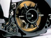 さらに軽量化されたNEWタイプSVSユニット ブレーキブロックのON/OFFを片側だけで支えるタイプにすることで、3方向のみにユニット自体が半減。ブレーキブロックを固定するシャフトもジュラルミン化することで、スプール全体のユニット重量の超軽量化を実現しました。ブレーキブロックは従来の標準3個に加え、新設計の小3個を交互に装着。従来以上に細かい設定を可能にしています。フリップオープンすると現れるスペアブレーキブロックホルダーには大(グレー)も装備しており、ブレーキ力の設定の幅を広げます。 |